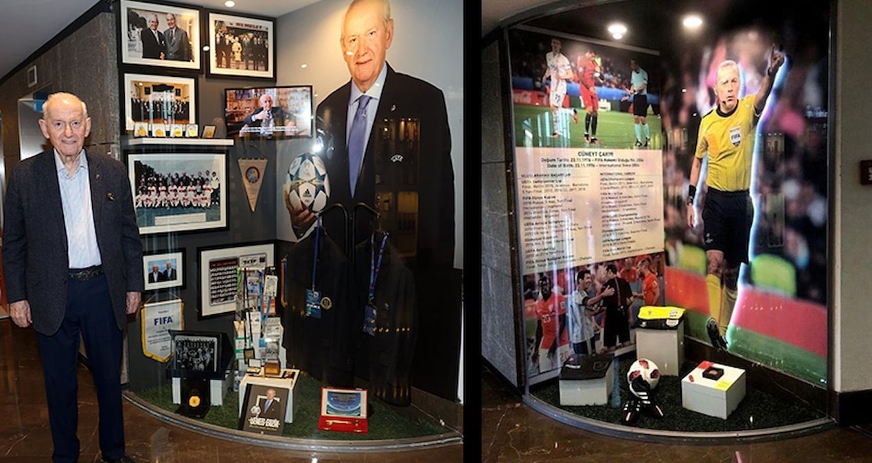 Riva Tesisleri’nde bulunan ve Cüneyt Çakır’ın kariyerine ışık tutan bu köşe, hakemin ulusal ve uluslararası maçlarda kullandığı düdük, kartlar, kramponlar ve formalarının yanı sıra yönettiği önemli karşılaşmaların detaylarını içeriyordu.